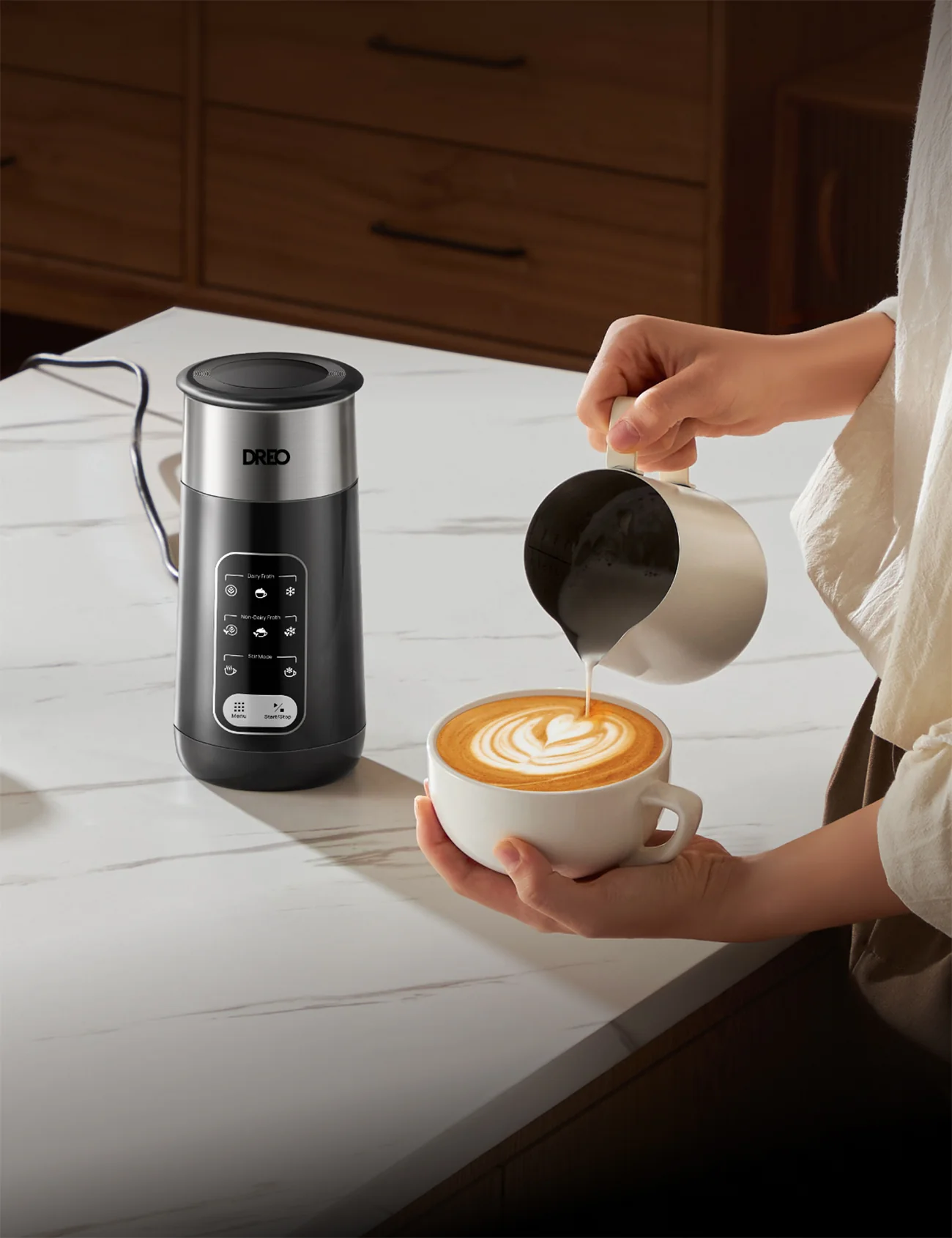 Erleben Sie mit dem Dreo BaristaMaker Air perfekten Milchschaum auf Knopfdruck und genießen Sie jeden Kaffee wie vom Profi zubereitet. Lassen Sie sich von cremigem, feinporigem Schaum verführen, der Ihre Sinne begeistert und jedes Getränk zu einem besonderen Moment macht.